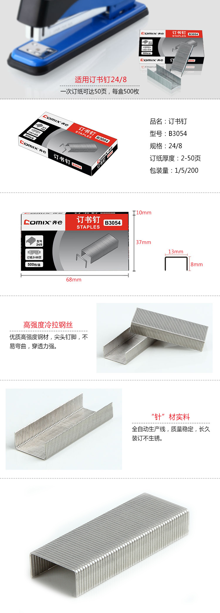 商品名称:齐心 B3054 加厚订书钉(24/8)50页订书机专用配钉