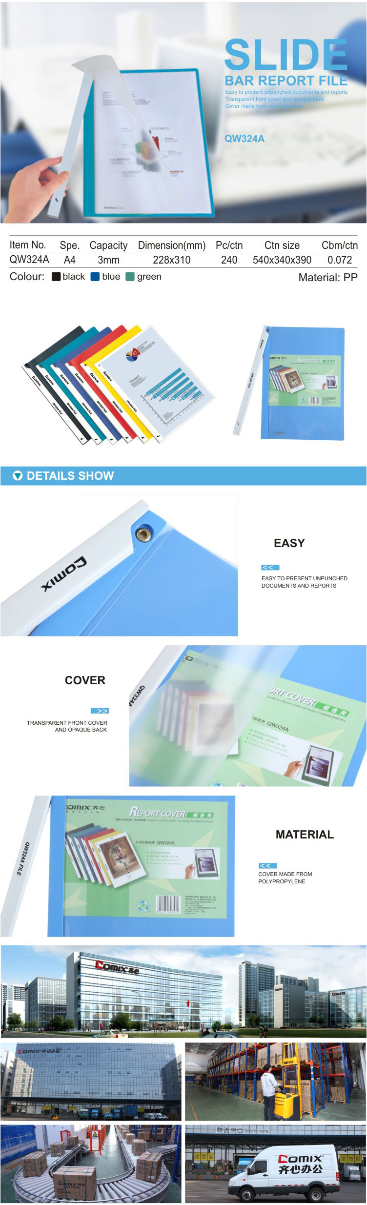 商品名称:齐心 QW324A 办公必备拉边杆 报告夹 A4 10张