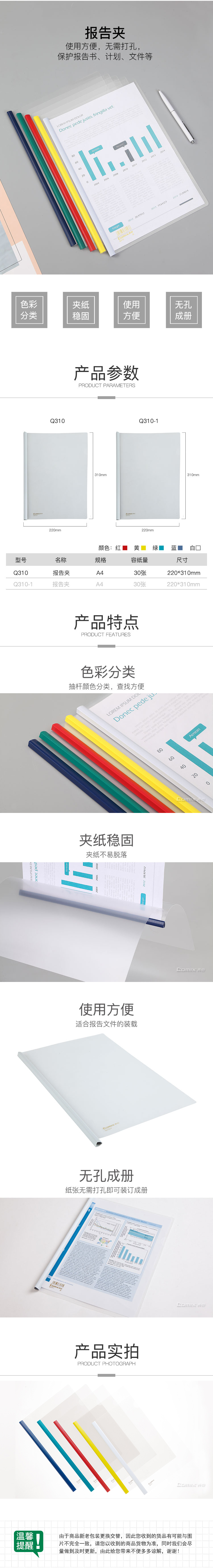 商品名称:齐心 Q310 办公必备 报告夹 A4 抽杆式抽杆夹 30张 10个装