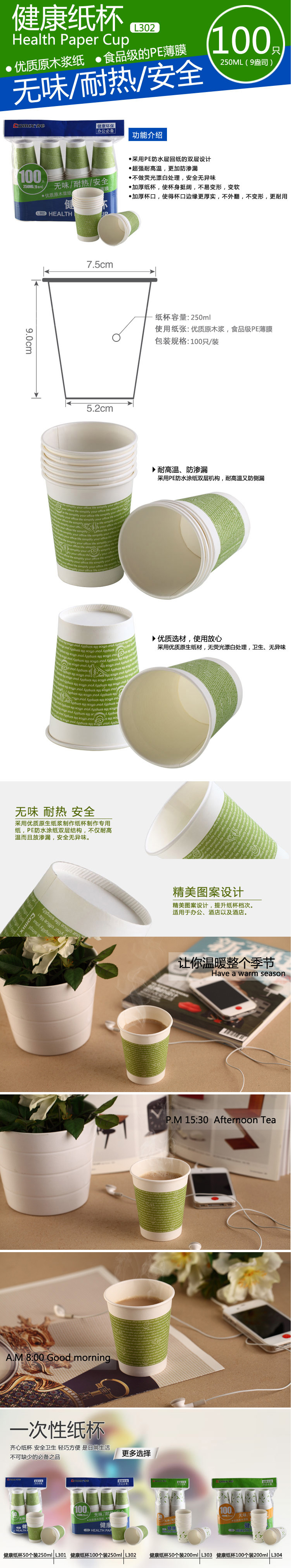 齐心 L302 健康纸杯100个装9安