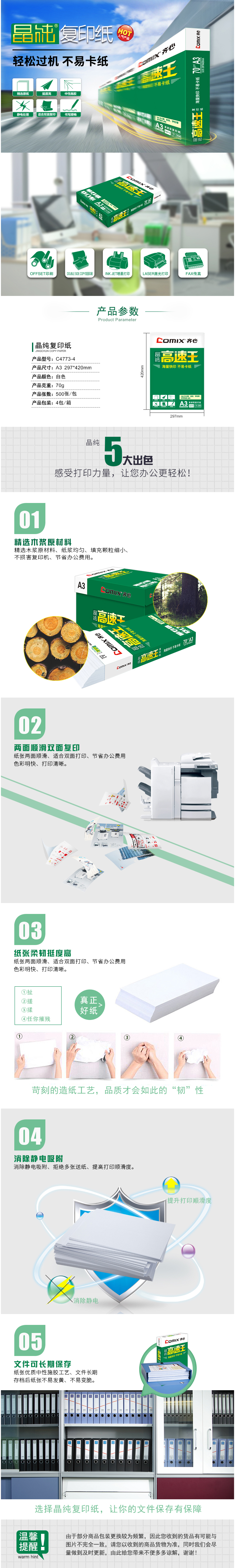 商品名称:齐心 C4773-4 晶纯高速王复印纸打印纸70克 A3 4包/件 35件/整卡板
