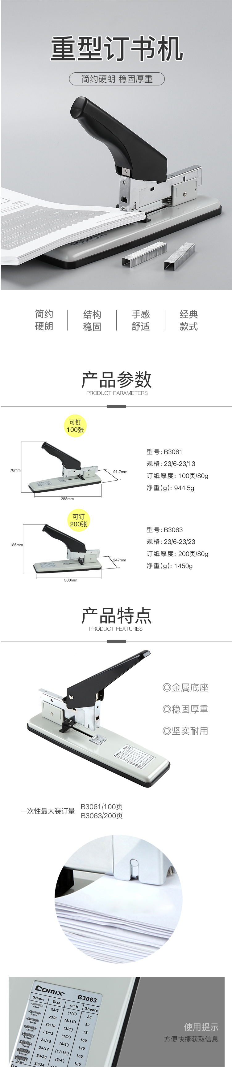 商品名称:齐心 B3063 重型订书机 200页使用23/6-23/23订书钉
