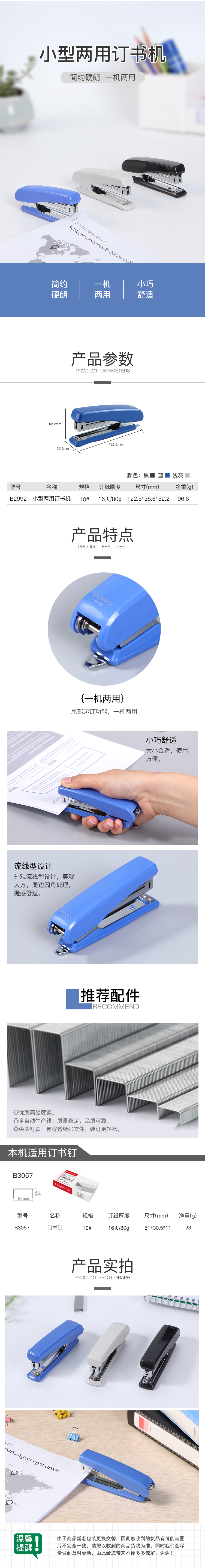 商品名称:齐心 B2992 小型强力耐用订书机 10#金属机