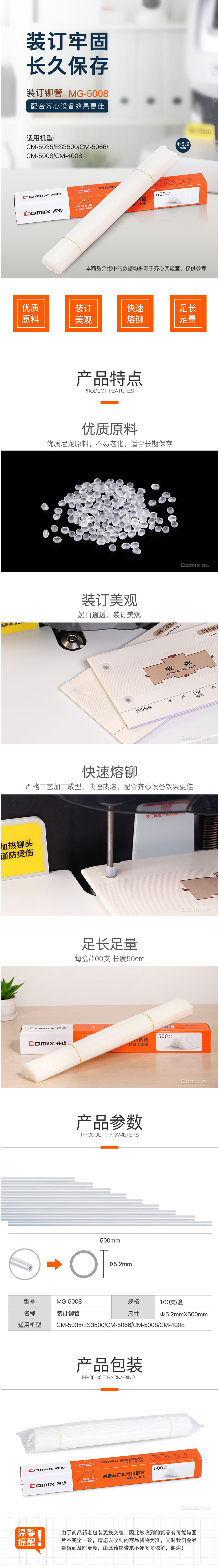 商品名称:齐心 MG-5008 财务装订机铆管 φ5.2*500mm CM-5008专用