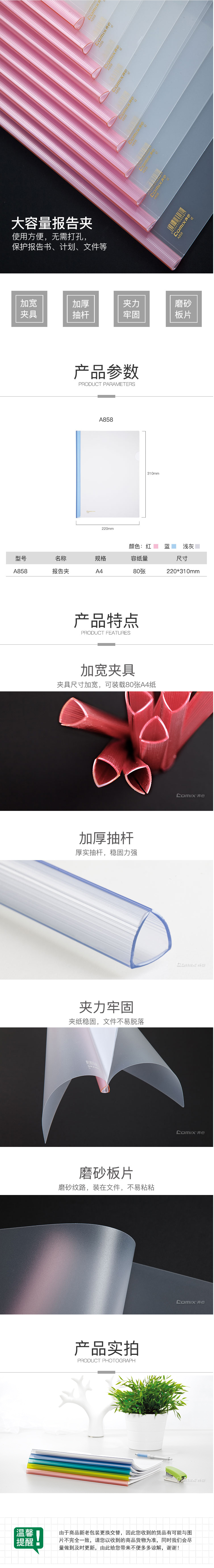 商品名称:齐心 A858 大容量加厚型报告夹 A4 抽杆式抽杆夹 80张 10个