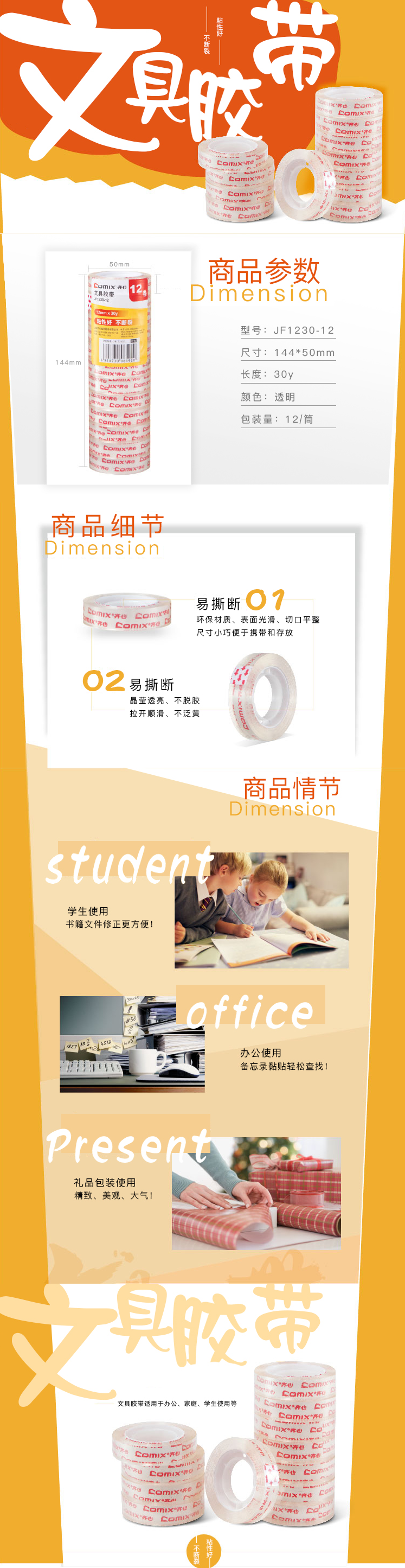 商品名称:齐心 JF1230-12 文具胶带 12mm*30y 12卷装