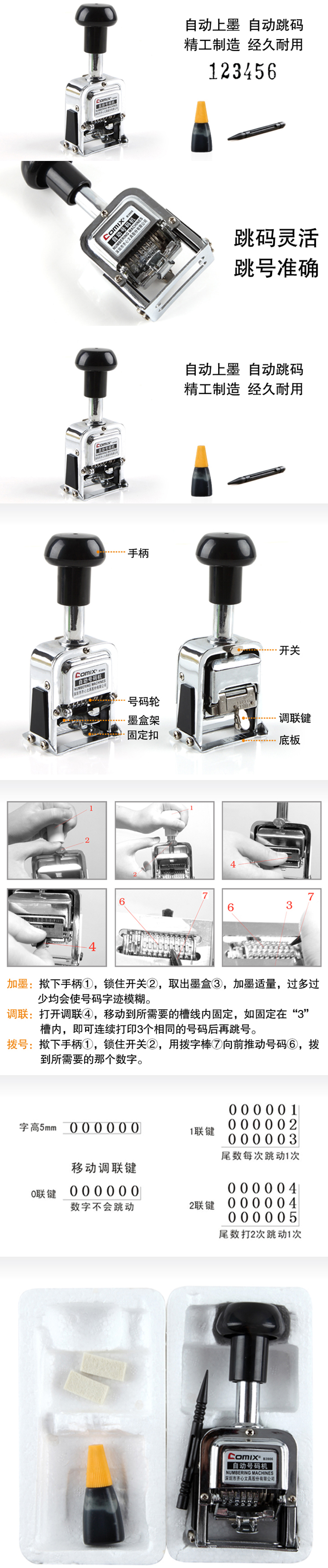 商品名称:齐心 B3906 耐用精钢自动号码机 6位