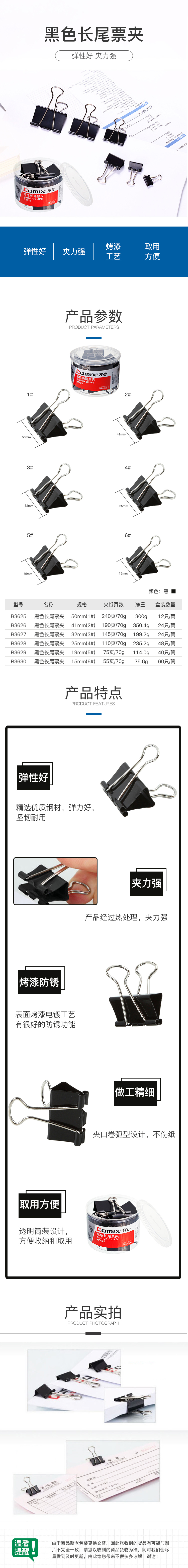 商品名称:齐心 B3630黑色长尾夹票夹 6# 15mm 60只/筒