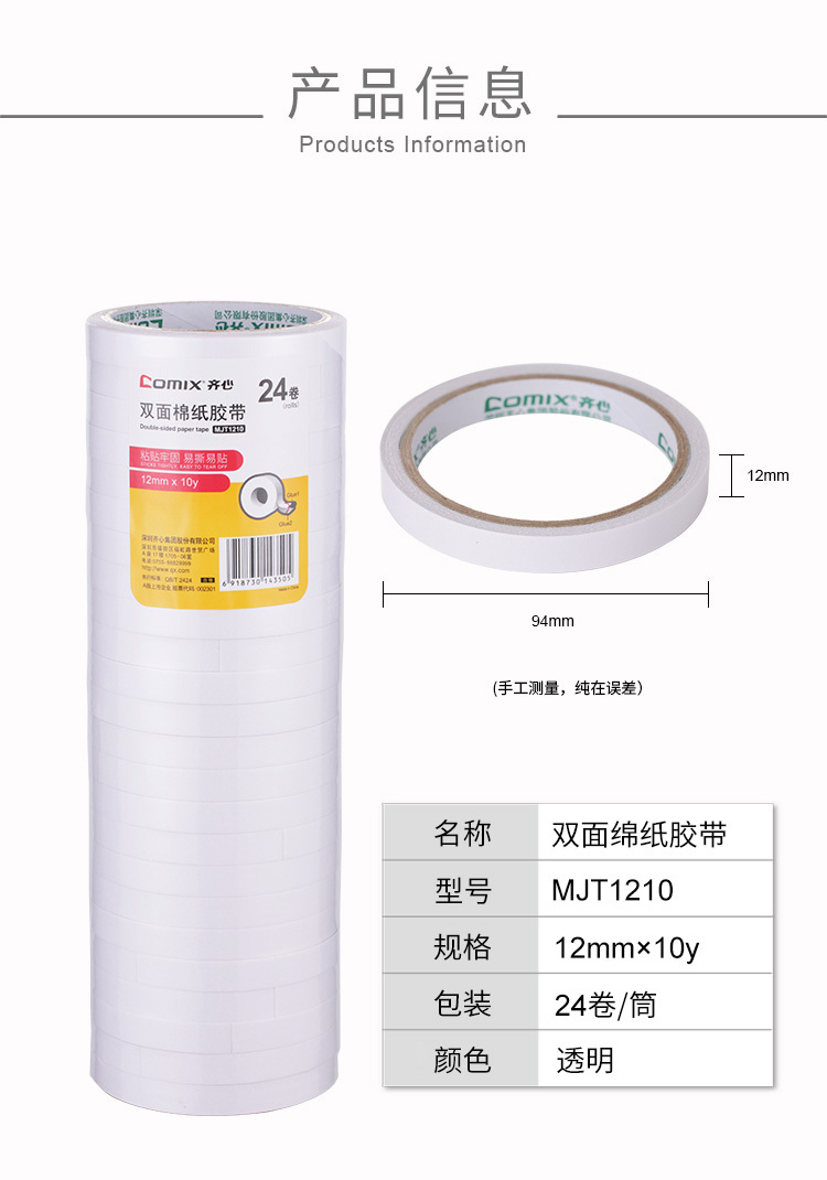 商品名称:齐心 MJT1210-10 双面胶棉纸胶带 12mm*10y 10卷装