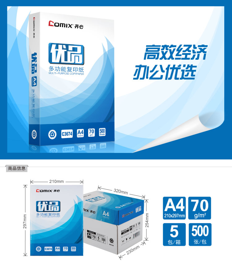 商品名称:齐心 C3674-5 优品复印纸 打印纸A4 70g